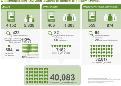 ENGAGE proves that participative communications campaigns lead to concrete energy results. By the end of 2012 participants in the 12 ENGAGE pioneer cities monitored were able to avoid 40,000 tonnes of CO2 emissions. On average, a citizen has reduced his/her annual CO2 emissions by 12%! |