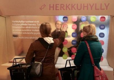 Exhibition visitors collecting different kind of carbon free “delicacies” in their purchasing basket – for example “I spend one evening in the candle light with my beloved ones without the use of electronical equipment“.